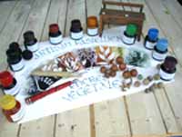 Encres végétales de L’Artisan Pastellier Noir de Campêche, Violet de sureau, Brun de noyer, Rouge de Brésil,