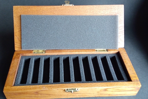 Coffret en bois 10 pastels secs. Beau, solide avec ses ferrures en laiton doré. (24 cm x 10,5 cm x 4,7 cm)