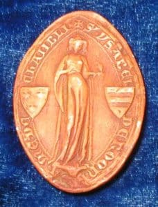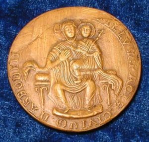 Sceau de 1243 représentant la Vierge nimbée, assise, vus de face, tenant l’Enfant nimbé et porteur de la croix.