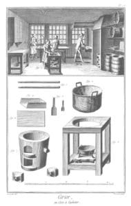 Les cires à cacheter étaient fabriquées dans une chaudière (figure 1). La cire à cacheter obtenue se présentait sous la forme d’une matière épaisse et filante. Puis cette cire à cacheter encore chaude était mise en forme de baguettes de diamètre plus ou moins important, suivant la taille souhaitée, par deux ouvriers « tireurs ». Ces baguettes de cire à cacheter étaient ensuite reprises sur une plaque chauffante (figure 2) où la cire à cacheter était ramollie et mise en forme ronde en les roulant à la main ou carrée en l’aplatissant à l’aide d’une planchette de bois.